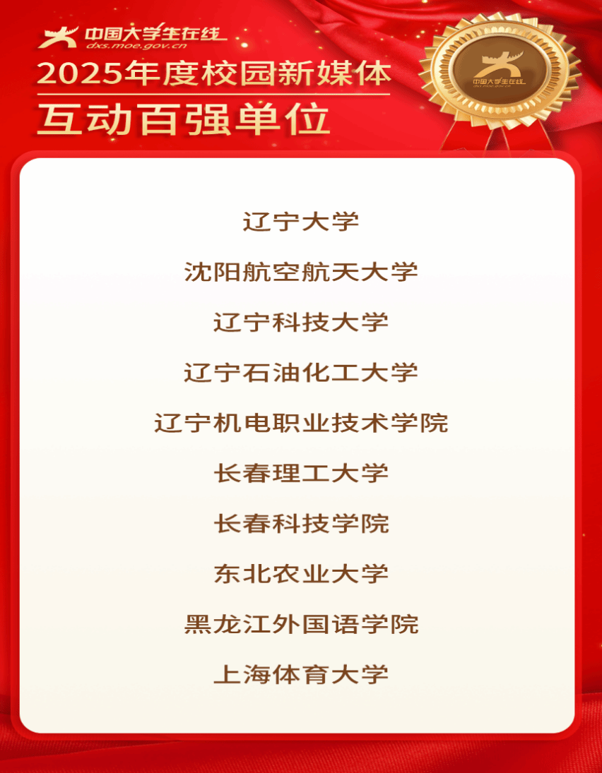 1月8日,教育部中国大学生在线公布了2025年度校园新媒体融合共建表彰名单。我校凭借优质内容产出与高效师生互动,荣获“2025年度校园新媒体互动百强”(辽宁省6家)和2025年度校园新媒体成绩突出个人(教师)(辽宁省7人)两项荣誉!