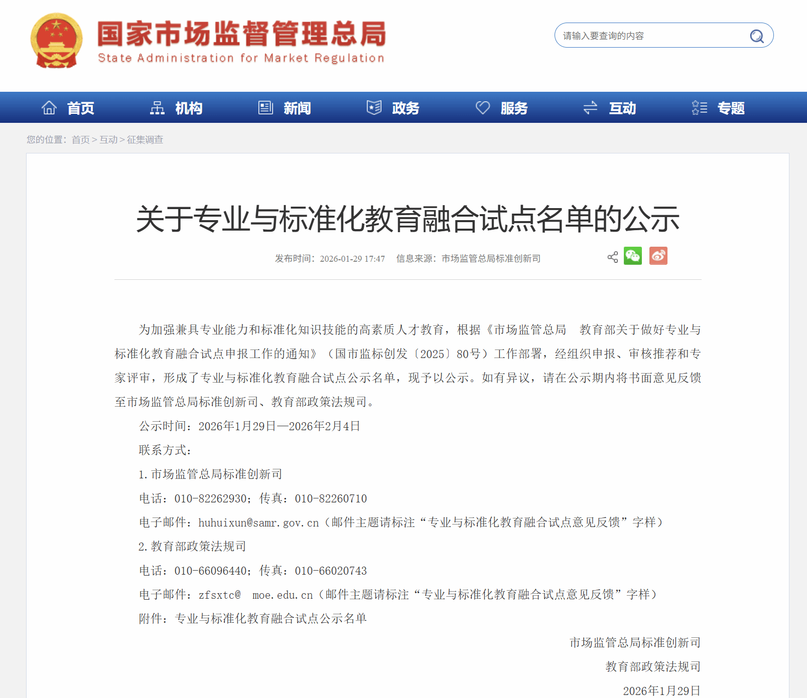 近日,国家市场监督管理总局、教育部联合公示了首批全国专业与标准化教育融合试点名单。全国共有253所院校281个项目入选,其中辽宁省11所高校14个项目入选。我校信息与控制工程学院自动化专业凭借优异表现成功入围。