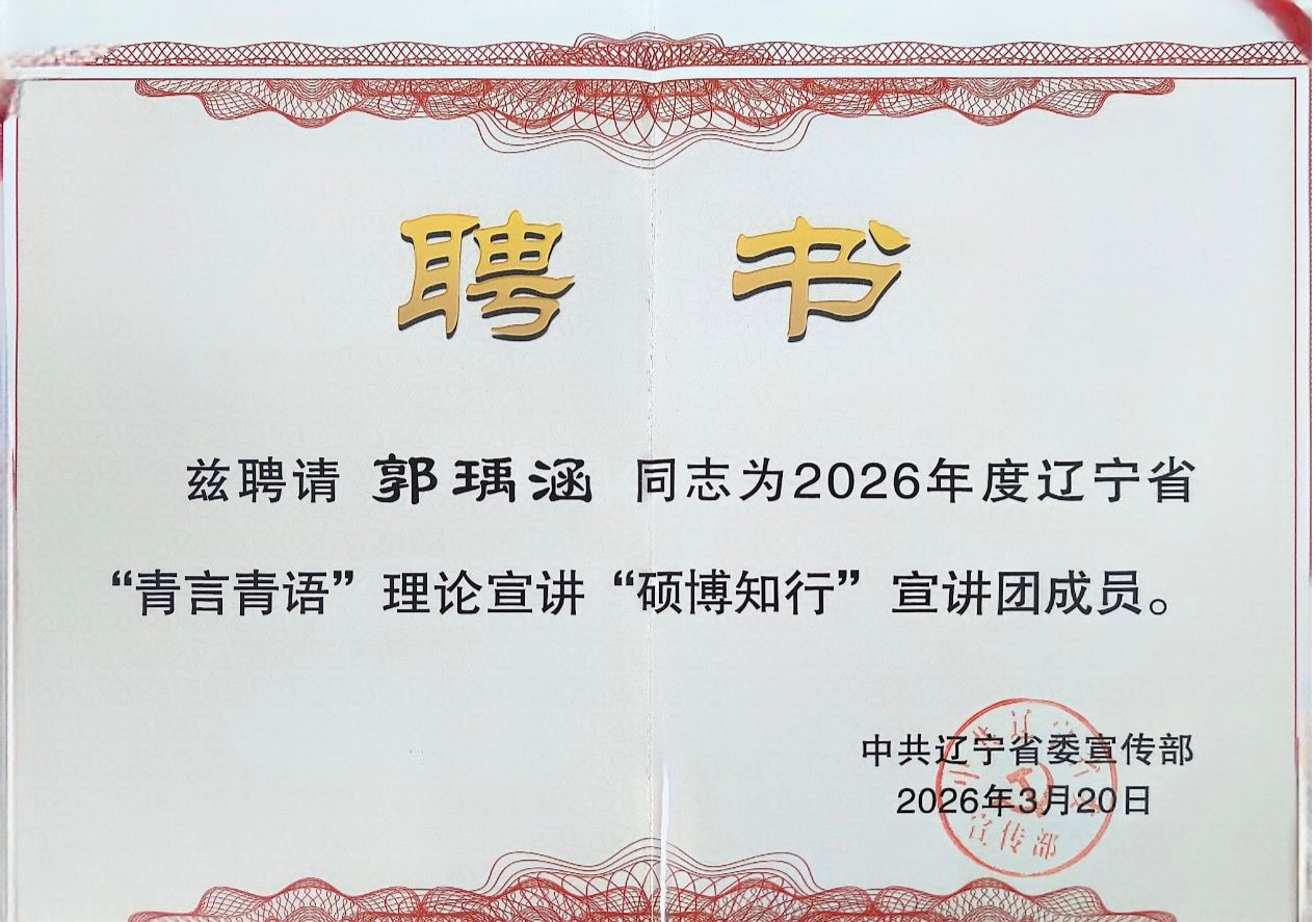 据悉,为更好发挥青年宣讲在凝聚青年思想、激发青年活力、推动社会发展中的重要作用,通过青年讲给青年,青年学习青年,青年影响青年,推动党的创新理论用心践行落地生根,辽宁省委宣传部、辽宁省委金融工委、辽宁省直机关工委、辽宁省教育厅、辽宁省国资委、辽宁省总工会、共青团辽宁省委、辽宁省妇联等八个部门在全省各地各相关系统和领域共同开展“青言青语”理论宣讲工作,辽宁省委宣传部专门组建“青年先锋”“硕博知行”“基层名嘴”三支示范宣讲团。其中“硕博知行”宣讲团面向全省严格遴选,仅招录20名政治立场坚定、具备宣讲经验、说服力与感染力强、拥有校级以上荣誉的硕士博士研究生。我校马克思主义学院研究生“燎原”宣讲团成员郭瑀涵凭借扎实理论素养与突出宣讲能力成功入选,正式受聘为2026年度辽宁省“青言青语”理论宣讲“硕博知行”宣讲团成员。