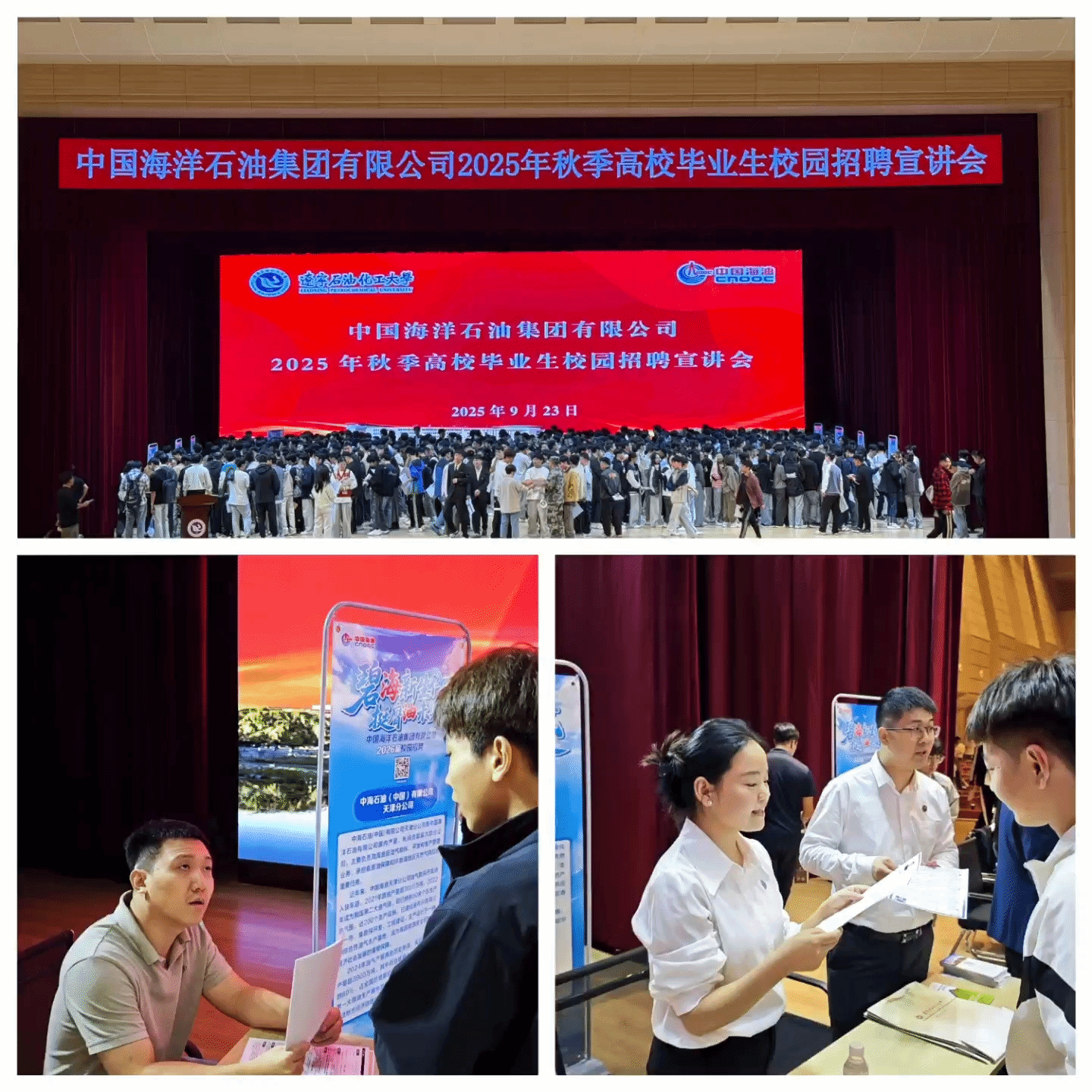 9月23日、25日、26日,学校连续举办中国海油、中国石油和国家管网集团三大石油石化行业单位大型专场宣讲招聘会,取得显著成效。三场宣讲招聘会共计来校企业74家,提供优质岗位9354个,吸引毕业生5000余人次到场应聘,现场投递简历近4000份,达成就业意向660人,为2026年就业季和2026届毕业生高质量就业注入强劲动力。