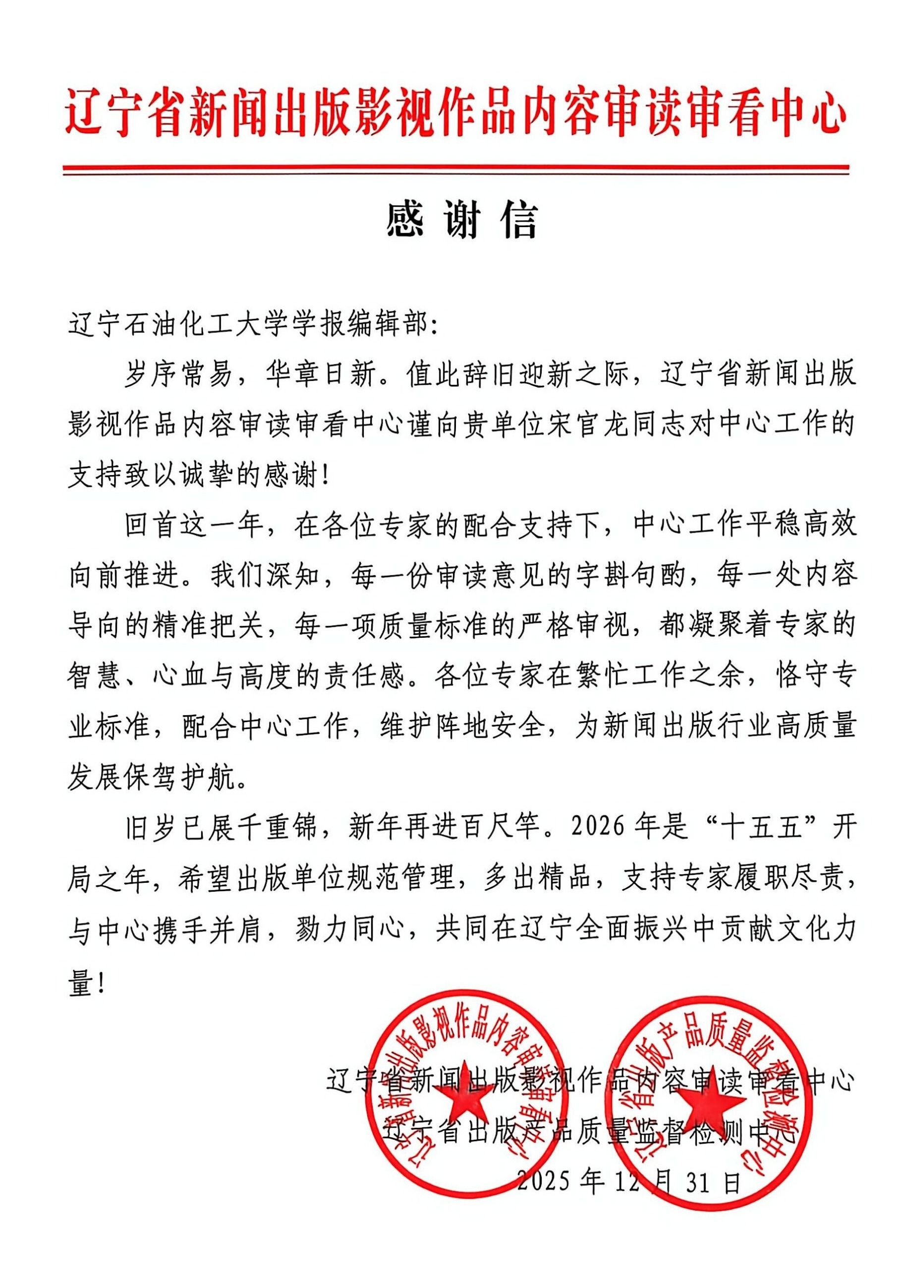 此次获赠感谢信,不仅是对宋官龙同志个人专业能力与责任担当的肯定,更充分彰显了我校学报编辑部在学术期刊出版领域的专业影响力与行业认可度。未来,学报编辑部将继续秉持专业精神,鼓励全体编辑发挥学术优势,积极响应行业发展号召,以更高标准做好学术出版与内容把关工作,助力构建高质量新闻出版生态,为辽宁文化事业繁荣发展贡献辽石化大力量。(撰稿人:宋官龙 校对人:于哲 审稿人:王亚新)